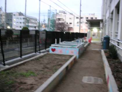 右は、体育館裏の自転車置き場付近のものです。ブロック塀から駒込柵に代わって、とても明るくなりました。校内から外が見渡せるので、開放感が生まれました。