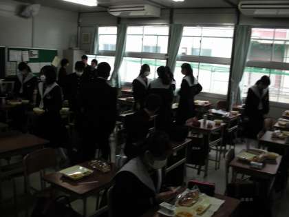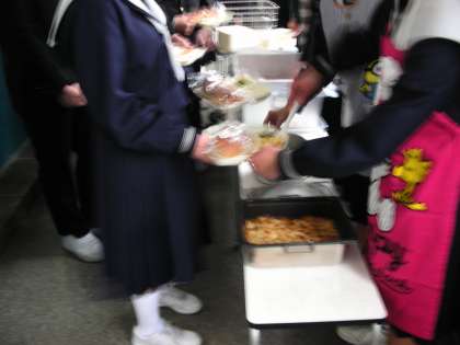 昼食の時間は、楽しい一時です。おいしくいただけるように、協力し合っています。