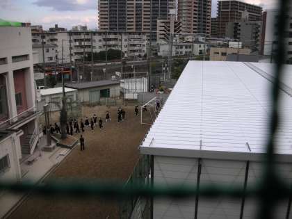 都島中学校では工事が行われているので、仮設校舎にいる1,2年生は、高い所に逃げなければなりません。1年生は、西館4階の廊下に避難しました。2年生は、体育館の上のプールサイドに避難しました。プールサイドは、4階と同じ高さがあります。