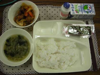 本日は、酢豚、ワンタンの皮のスープ、焼き海苔、米飯、牛乳、発酵乳です。