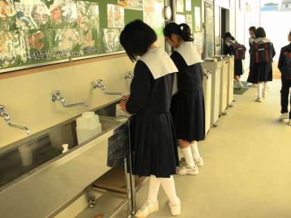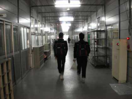 登校してきた生徒が仮設校舎の廊下を歩いています。