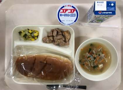 本日の献立は、鶏肉のオイスターソース焼き、糸寒天のスープ、チンゲンサイとコーンの中華あえ、ヨーグルト、おさつパン、牛乳でした。