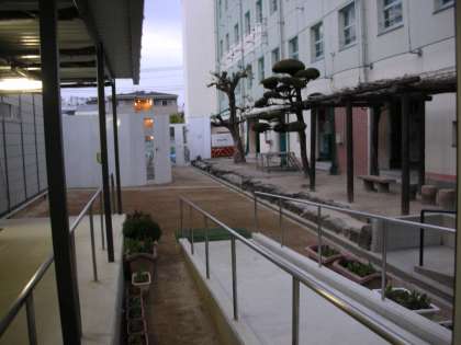 仮設校舎前の渡り廊下から撮影した写真です。左が仮設校舎、右が西館です。