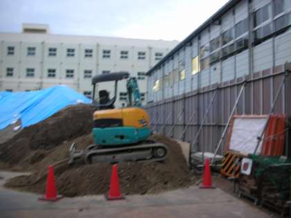 左が南館の建築現場です。右は、仮設校舎付近です。高く積み上げられた土は、風で土ぼこりが舞い上がらないように、ビニールシートで覆われています。この土は、南館工事現場の基礎部分が出来上がった時に再利用されるものです。
