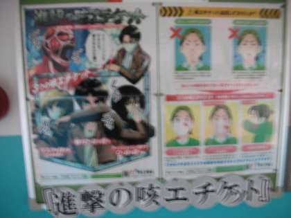 保健室前の掲示板には、健康にかかわるポスターが掲示されています。『進撃の咳エチケット』というポスターは、とても説得力があるものです。