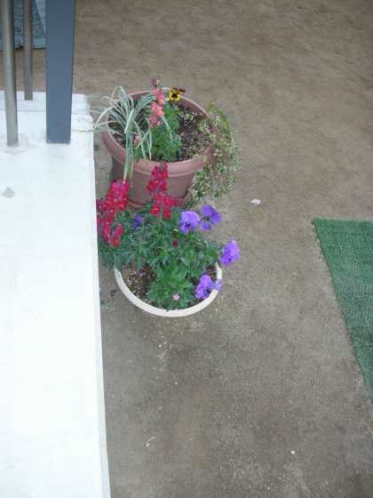 仮設校舎前には、プランターが並べられています。色とりどりの花が植えられています。ボランティア部の人たちがお世話をしています。そのおかげで花たちは、活き活きと育っています。