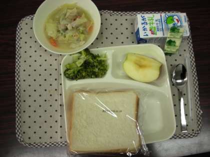 本日の給食は、鶏肉と野菜の洋風煮、ブロッコリーのサラダ、リンゴ、パン、牛乳でした。