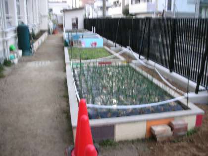 保健室裏のボランティア部の畑です。たまねぎが育ってきました。