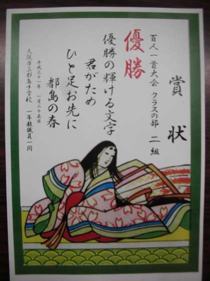 1年生百人一首大会の熱戦を制したのは、2組でした。2組のみんな、おめでとう。良く頑張りました。