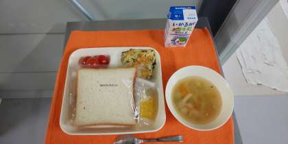 本日は、帆立貝のグラタン、だいこんのスープ、プチトマト、パン、牛乳です。パンは食パン2枚で、マーマレードが添えられています。