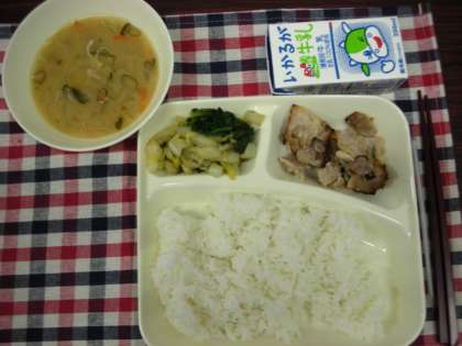 本日は、豚肉のごまだれ焼き、味噌汁、きくなとはくさいのおひたし、米飯、牛乳でした。