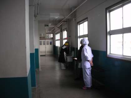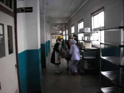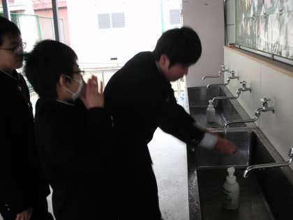 給食当番以外の人は、少し遅れて手を洗いに来ます。石鹸できれいに洗います。