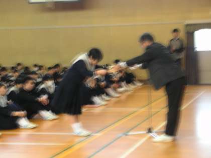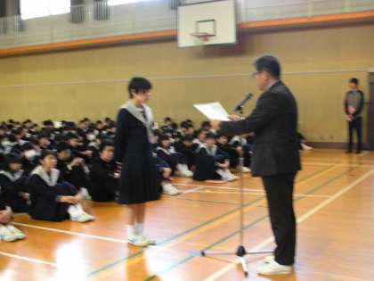 先週の日曜日に、都島ベルファで『特殊詐欺撲滅ポスターコンクール』で第一位の表彰状を獲得した2年生女子に、表彰状を伝達し、目録を全校生徒に披露しました。
