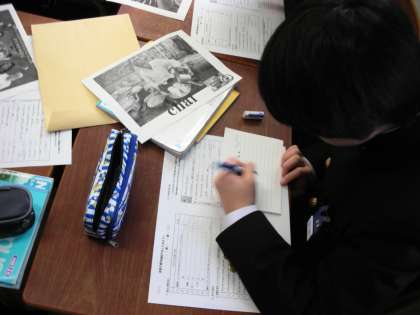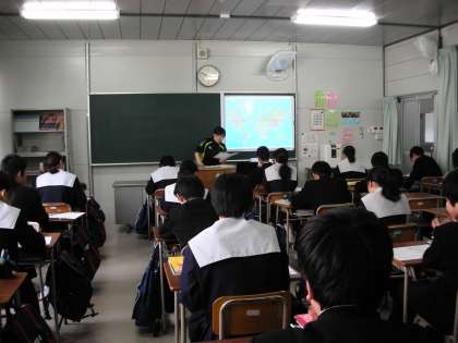 今日は、1年2組の英語の授業です。教科指導は、卯野先生です。この日の授業は、くじで選んだ国や地域を英語でプレゼンするという授業です。