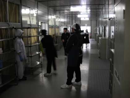 給食の準備の様子です。配膳されたワゴンの前には、配膳員さんと教職員が給食当番の到着を待っています。