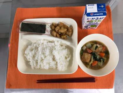 本日の献立は、あげ鶏のねぎソースかけ、あつあげと白菜の中華煮、焼きのり、ご飯、牛乳です。