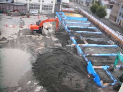 西館4階から見た工事現場の様子です。 南館校舎の基礎部分に土がどんどん戻されています。