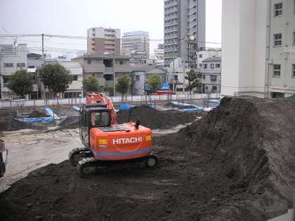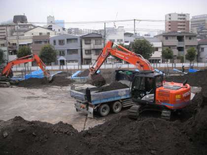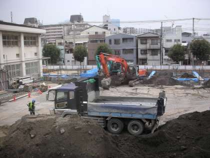 今日は、ダンプカーが1台フル稼働しています。ショベルカーがすくった土をダンプカーに積み込みます。ダンプカーは南館の基礎部分の近くに運び、土をおろします。基礎部分にいる別のショベルカーが土を丁寧に基礎部分に埋めています。