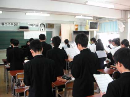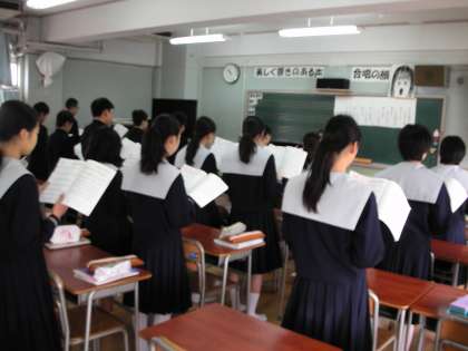 生徒たちは、歌を歌い、歌詞の意味を考え、CDの声楽家の歌を鑑賞しました。そして、詩の意味を考え、曲の感想をワークシートに書き込みました。