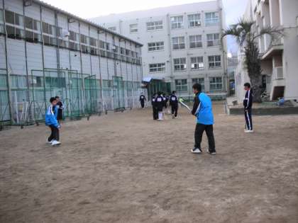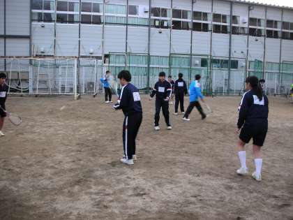 校内のグラウンドで、ソフトテニス部が練習をしています。狭いグラウンドなので、工夫を凝らした練習をしています。