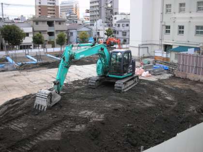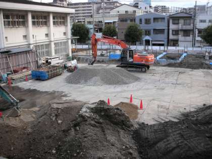 仮設校舎前にあった山のような土がかなり低くなってしまいました。