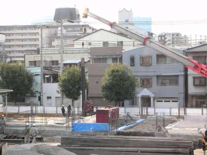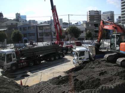 下は、引き抜かれた鉄板を大型トラックで運び出そうとしています。その横では、ショベルカーが余った土をダンプカーに載せています。撤去するためです。