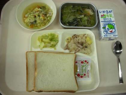 本日は、中華おこわ、卵スープ、キャベツのオイスターソースいため、パン、牛乳です。