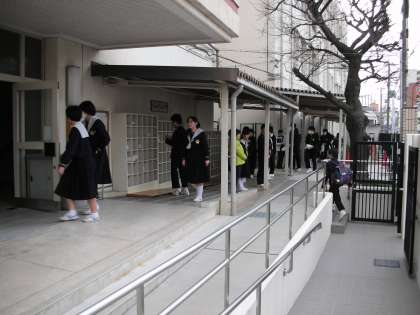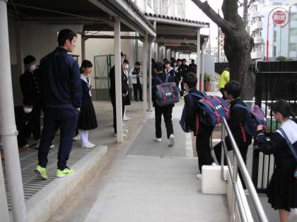 朝の時間には、体育館に向かう3年生と登校してきた生徒が交差します。