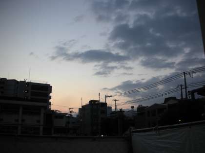 エレベーターホールと放送室の間から見た東の空です。 雲を払うように、日の出の光が差し込もうとしています。
