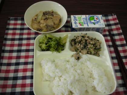 本日は、すき焼き煮、ブロッコリーのしょうゆづけ、ツナっ葉炒め、米飯、牛乳でした。すき焼き煮は個別対応献立になっています。