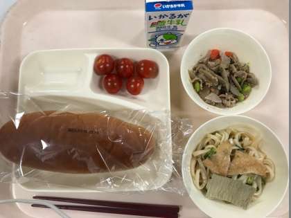 本日の献立は、豚肉とごぼうの煮もの、なにわうどん、プチトマト、黒糖パン、牛乳です。