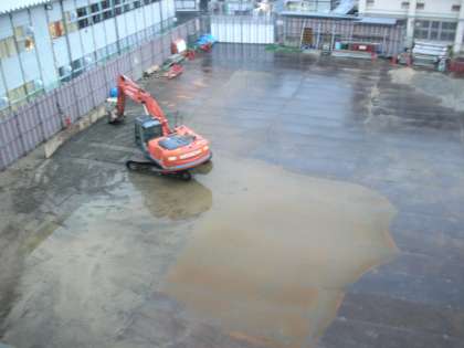 作業場一面に敷かれた鉄板のうえに、水が溜まっています。昨日の雨がしっかりと降ったことの証明ですね。