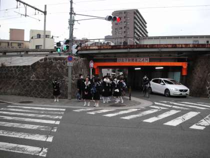 カミナリガードのところでは、信号待ちしている児童・生徒、自動車がいます。交通ルールを守って、行動しています。