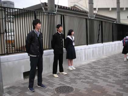信号を渡ったところには、風紀委員の人が先生と一緒にあいさつ運動をしています。