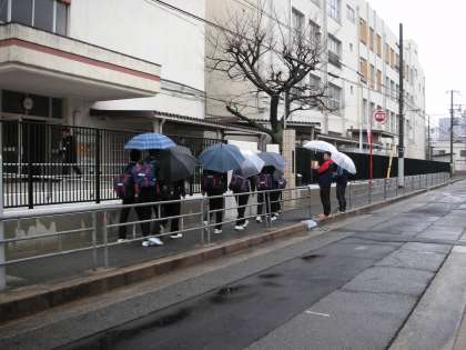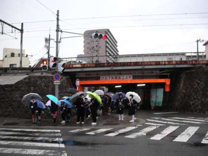 雨がしっかりと降っているので、みんな傘をさしています。カバン以外に傘を持つので、本当に「めんどくさい」というのが本音でしょうか。