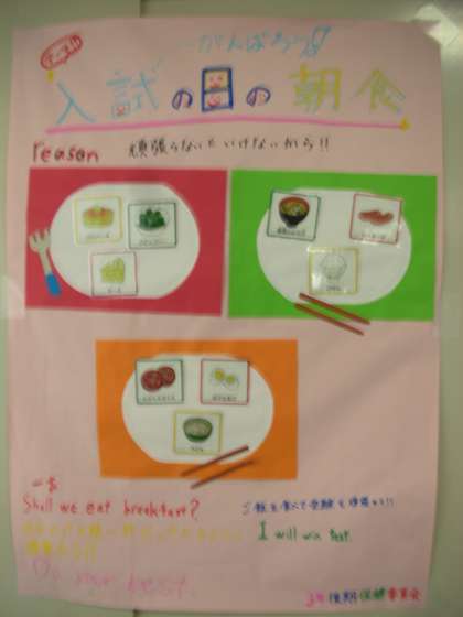 昨日の給食 公開日 2019/03/01 更新日 2019/03/01 お知らせ 3年生の廊下に『入試の日の朝食』という掲示物がありました。保健委員会が作製したものです。良く調べて造られています。 いいね(0)