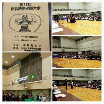 都島区スポーツセンターで、第13回都島剣道優勝大会が開催されています。この大会は、いつもの学校の対抗戦ではなく、道場の対抗戦です。中学校の試合とは異なり、小学生から一般までたくさんの剣士が参加しています。