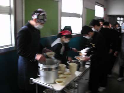 給食当番の人が、配膳の準備をしています。