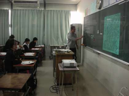 1年生の社会の授業では、長畑先生がパソコン画面の地図を大画面にして、説明しています。大きな地図を使うと、とても分かりやすくなりますね。