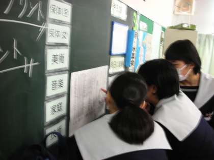 給食の準備をしている2年生の教室では、女子が掲示されている『公立高校一般選抜』の出願状況の新聞記事を真剣に見つめています。