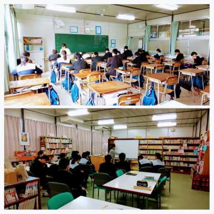 2年生の教室と図書室に分かれて授業をしています。習熟度別少人数授業を行っています。