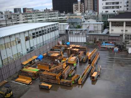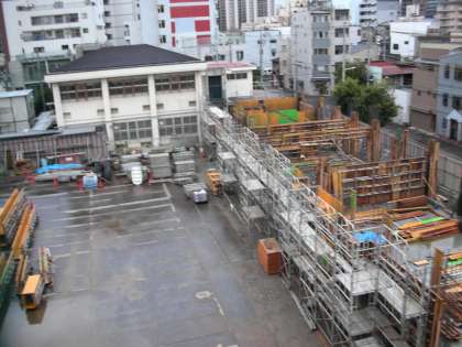 南館の建築現場では、間仕切りの木枠が設置されています。