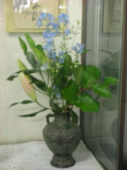 仮設校舎入り口内に、地域の方がお花を生けに来てくださいます。 美しい花の色や歯の緑色に心を癒されますね。