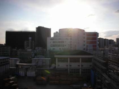 さて、西館4階から見た東の空です。まぶしい太陽がお隣のマンションの上から顔をのぞかせています。日の出の時間が本当に早くなっています。
