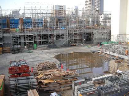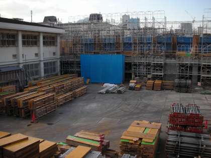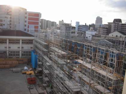 上は、西館4階から見た工事現場の様子です。足場がほぼ4階の高さに達しています。
