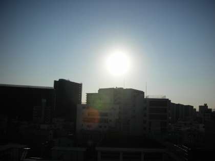 さて、写真は、西館屋上から見た東の空の様子です。まぶしい太陽が昇っていきます。今日も良い天気になりそうですね。