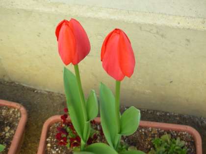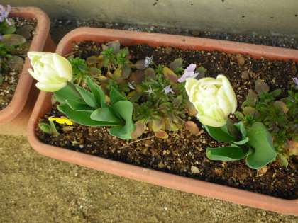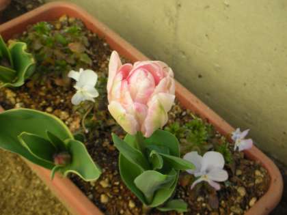 八重のチューリップ(ピンク、白)、赤色のチューリップが咲きました。自然界の色は、目に優しく溶け込みますね。