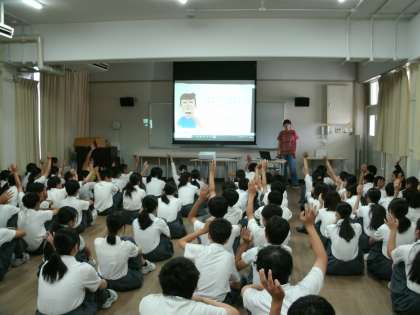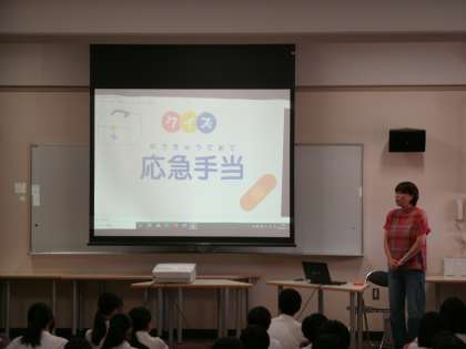 1年生の学年集会にて、保健室から応急手当についてお話ししました。けがをした時、ねん挫した時、やけどした時など、正しく応急手当てをするにはどうすればよいか、○×クイズ形式で行いました。今後、2・3年生でも順次、学年集会にてお話しする予定です。