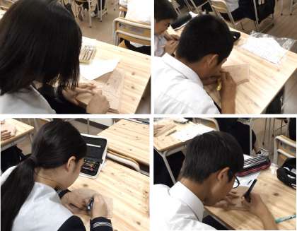理科では、圧力について学習しています。今日は大気圧を体感するために、燃やしたエタノールを入れた2つの器が大気圧に押されて離れなくなる実験をしました。試行錯誤して実験し、大気圧の強さを実感しました。美術では、彫刻刀を使った木彫りを行っています。それぞれがデザインしたものを木板に描いて、彫刻刀を使って形作っています。彫刻刀の使い方を確認しながら、慎重に木を削っていました。