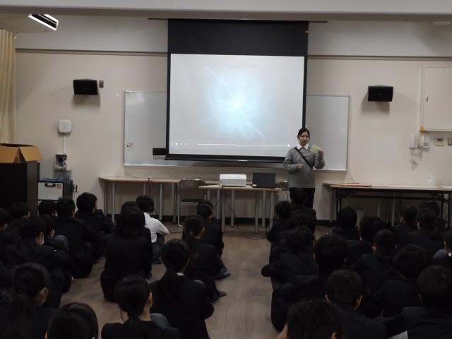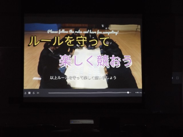 1年生の学年集会では、1月末に実施する百人一首大会に向けて、図書文化委員と国語係が協力して、百人一首大会のルールを動画撮影して放映しました。